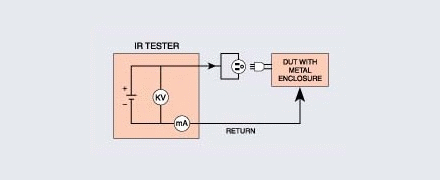 絕緣阻抗的測試與耐壓測試其接線方式大致相同,主要是量測兩個端點之間及其週邊連接在一起的各項關聯網路所形成的等效電阻值, 絕緣電阻是指用絕緣材料隔開兩部分導體之間的電阻稱絕緣電阻,為確保電氣設備運行的安全,對其不同極性(不同相)的導電體之間,或導電體與外殼之間的絕緣電阻提出一個最低要求。