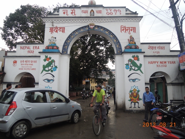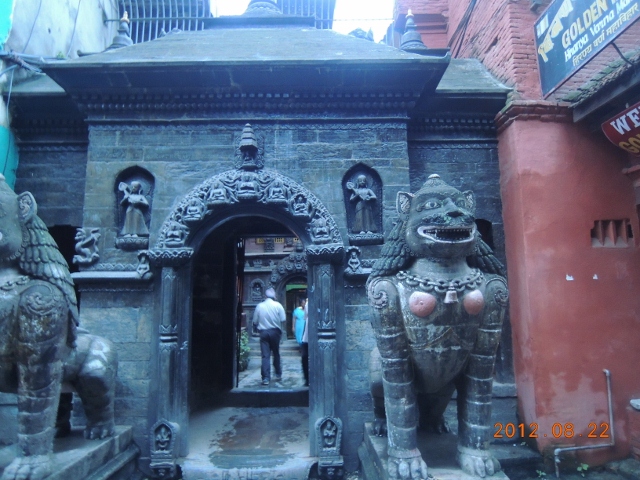 事實上"莊嚴"這個詞彙,台灣人很多都用錯,特別是用來形容法師"法相莊嚴",其實佛經裡面講的"莊嚴",主要是指"裝飾",法師法相美好,說他"莊嚴",就好像說法師本身化妝,化得很體面,那才是所謂的"莊嚴",事實上所有的法師,除了上電視因應轉播的需要以外,大概幾乎都是"素顏"。可是尼瓦佛教的寺院可不"素顏",你看上圖的寺院大門。看出來了嗎?大門兩隻大石獅,門上面有所謂的"寶幔",上面雕飾了佛像與菩薩像,這就對了,你看見了你認得的佛與菩薩像,就可以大膽地走進這座寺院裡。