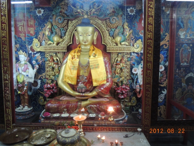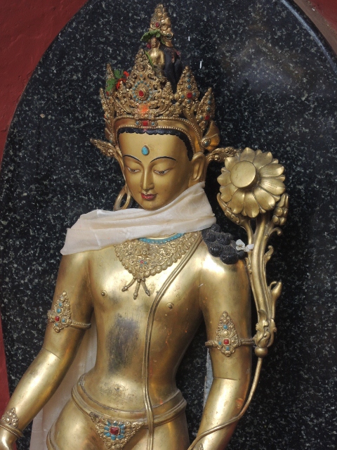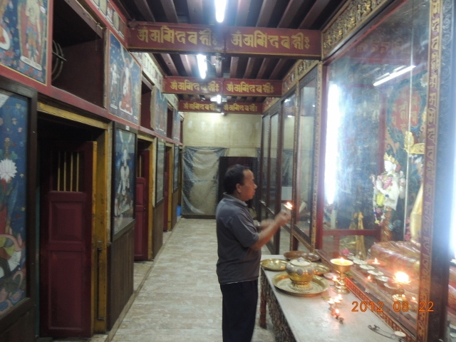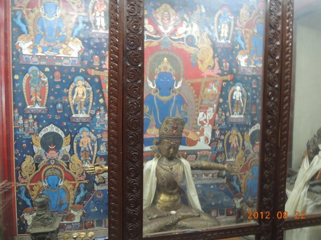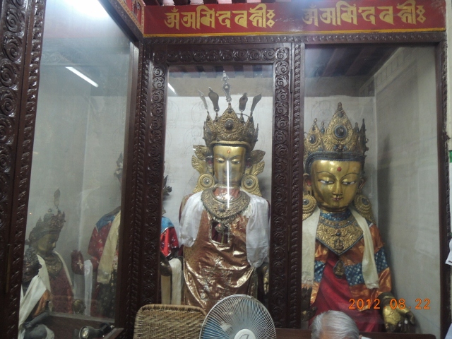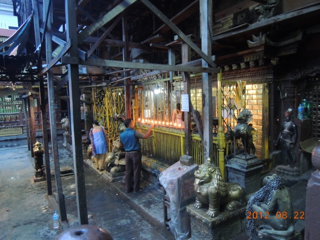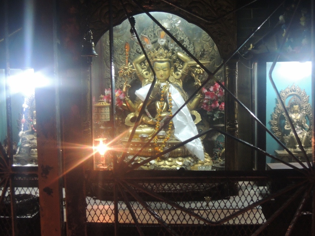 寺院的中殿是供養釋迦牟尼佛,可是尼瓦族的法師不讓我們接近,所以就沒有拍到照片。但是早課的時候,很多人都向釋迦牟尼佛,或是那座佛塔供養了酥油燈,當地點酥油燈很便宜,是隨喜發心的,看你要點多大盞都可以。在你的四周圍,你也會看見佛菩薩和你在一起: