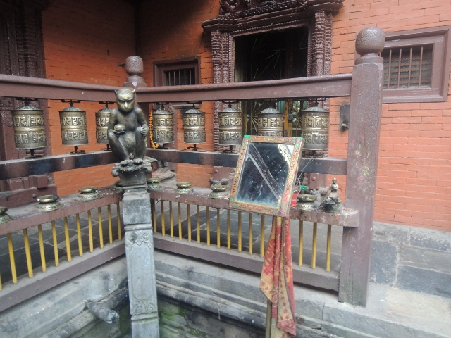 你發現好像看見很多佛像?其實很多都是天人,只要是佛陀時代印度人信仰的神祇,(是不是看到了"猴子"?猴子是印度人崇拜的神明之一)很多都在裡面。形成了佛經所寫的場面,還記得佛經一開頭不是都說,很多護法龍天都在裏頭,大家都來虔誠聽佛講經的畫面。尼瓦佛教寺院乾脆通通蓋出來,所以你一走進來,覺得好像到了極樂世界,或是來到了佛陀時代的法會盛況了。尤其是不是看見兩張照片裡面還有鏡子?這面鏡子事實上寺院中有三到四面,早課的時候,我看到許多尼瓦族法師,金剛瑜伽修士在課誦經典到了一個階段,釋迦族的出家和尚(短期的)就會出來拿著供養在釋迦牟尼佛前的鏡子向與會大眾照過去,這時法器聲,號角的鳴聲四面也會響起。頓時讓我覺得"佛光普照"的感覺。米蘭解釋,那些鏡子在金剛乘裡面都有意義,是象徵智慧之光。