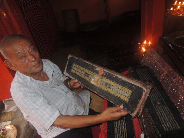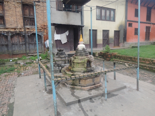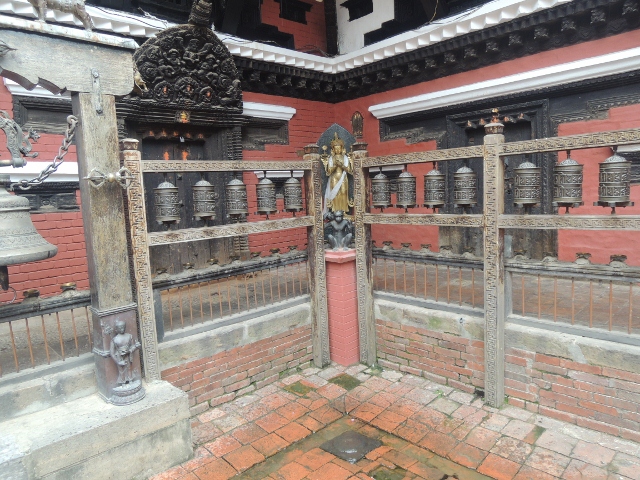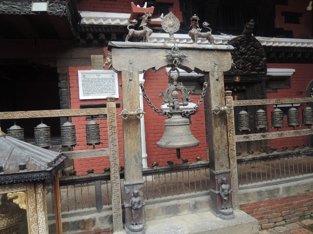 中庭的中央,都讓轉經輪所包圍,大概是三面。兩座經輪的中間就是那座鐘,尼瓦佛教徒每天朝禮過佛寺一定會來這座鐘敲幾響,告訴佛菩薩自己來拜佛了。這也就是我早晨五點鐘在睡床上聽見的,那一片饒有詩意鐘響。經輪上面書寫的咒語,我沒有看懂,也居然忘記問了。但米蘭說看你要唸哪一尊佛菩薩,我就唸了文殊師利菩薩的五字明,尼瓦人非常崇拜文殊師利菩薩,因為文殊菩薩曾經用祂手上那隻金剛寶劍劃破加德滿都這個湖泊,變成了一塊風水寶地,讓尼泊爾人,和尼瓦人都能在這裡成長。