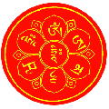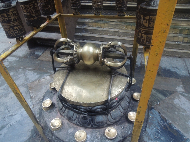這尊佛菩薩,其實在寺院的牆角,比照上面那張轉經輪的照片,就可以發現祂的位置,就是在兩座轉經輪的牆角處,用手就摸得到,這尊佛菩薩實在美得不得了!尼瓦佛教徒常常用頭去接觸祂的頂。要是在台灣,是不可能有這種景象,因為佛菩薩總是被供在佛殿裡面,怎麼會放在牆角上呢?但她確實就在牆角,和我們一樣站在廟裡面,面向大殿。所以你會發現,佛菩薩和我們同在廟裏頭,守護著廟宇,也親切對你微笑(究竟是哪尊?記得是觀世音菩薩,因為聽到Lokesvara這個詞,如果不對請告訴我)。大殿中央,除了這座佛塔以外,還有這個"法界曼陀羅",上面通常有個金剛杵。這座金剛杵也非常受尼瓦佛教徒的喜愛,常常用頭去接觸祂的頂接受加持。總之,尼瓦族的廟宇裡面,看起來不大,可是到處都看得見佛菩薩,不論是牆角,屋頂,樓上,樓下,乃至於各個角落都是,活像座曼達拉,就是壇城啦!至於黃金寺這座寺院主要供奉本師釋迦牟尼佛。