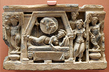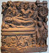 根據《八十誦律》、巴厘文中部·稀有未曾有法經》和《長部·大本經》記載,摩耶夫人在其父王的蘭毘尼園無憂樹下,站立生下了釋迦牟尼[16]。《中阿含經·未曾有法經》和《長阿含經·大本經》有佛從母右脇出生的說法。