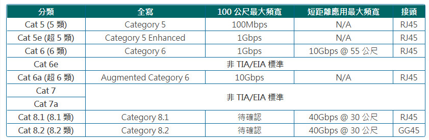 現代網絡一般使用 Cat 5 或以上,因為 Cat 1 至 4 只能提供 16Mbps 以下頻寬,一般已經不用了。筆者年輕,未接觸過 Cat 1 至 Cat 4 😛,所以就跳過不說了。以下是 TIA/EIA Cat 5 至 Cat 8 之比較。